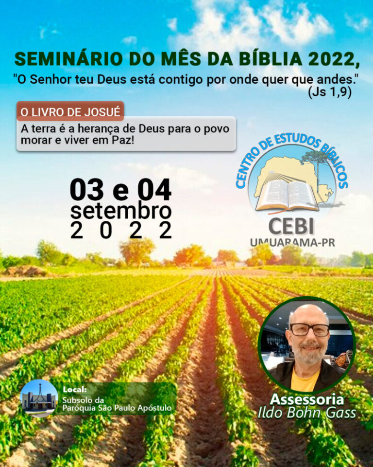 Josué será o livro bíblico estudado neste mês. Nos dias 03 e 04 de setembro, o Centro de Estudos Bíblicos (CEBI) promoverá, o estudo do livro de Josué, meditado e vivido neste mês da Bíblia. Os encontros vão acontecer no subsolo da Paróquia São Paulo Apóstolo, em Umuarama-PR. Neste ano, o estudo será sobre o […]
