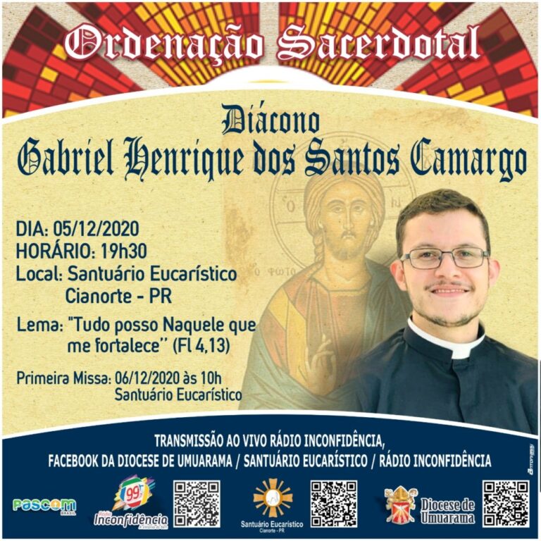 A comunidade pode acompanhar toda a celebração pelo facebook da Diocese de Umuarama e do Santuário Eucarístico Diocesano de Cianorte, pela Rádio Inconfidência e pela Rádio Capital de Cianorte No dia 05 de dezembro, às 19:30h no Santuário Eucarístico de Cianorte o diácono transitório Gabriel Henrique dos Santos Camargo será ordenado Padre. Por causa da […]