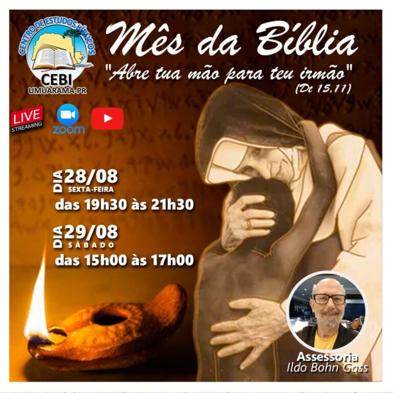 O Centro de Estudos Bíblicos de Umuarama (CEBI) está convidando você para um encontro sobre o mês da Bíblia deste ano 2020, fundamentado no livro do Deuteronômio, com o lema “Abre tua mão para o teu irmão” (Dt 15,11). Os encontros virtuais estão marcados para a próxima sexta-feira (28) às 19h e sábado (29) às […]