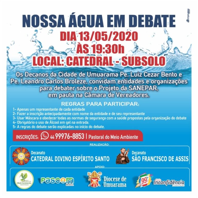 Os Decanos da Diocese de Umuarama, Padre Luiz Cezar Bento e Padre Leandro Carlos Broleze, irão comandar o encontro “Nossa Água em Debate”, no dia 13 de Maio, às 19:30h, no subsolo da Catedral do Divino Espírito Santo. Confira no convite abaixo as regras para participar. Publicação: Katya Suzuki Assessora de Comunicação Diocesana e PASCOM […]