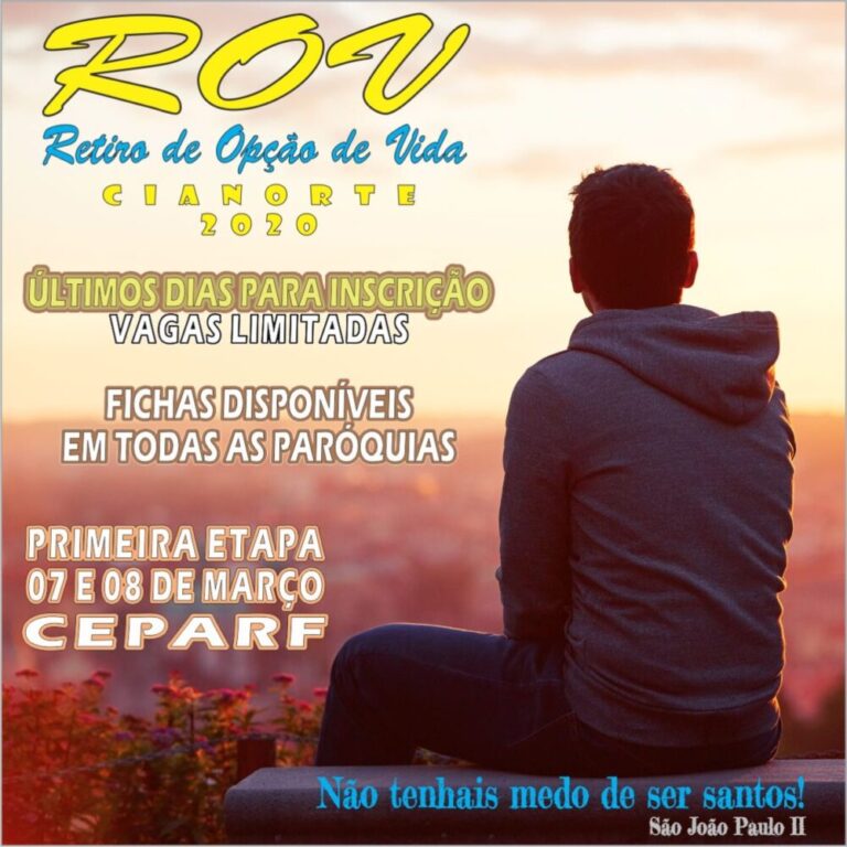 As inscrições para o Retiro de Opção de Vida (ROV) de Cianorte estão na fase final e podem ser feitas em todas as Paróquias do Decanato de Cianorte. O encontro acontecerá nos dias 7 e 8 de Março de 2020 e é destinado para qualquer pessoa a partir dos 15 anos de idade. O ROV […]