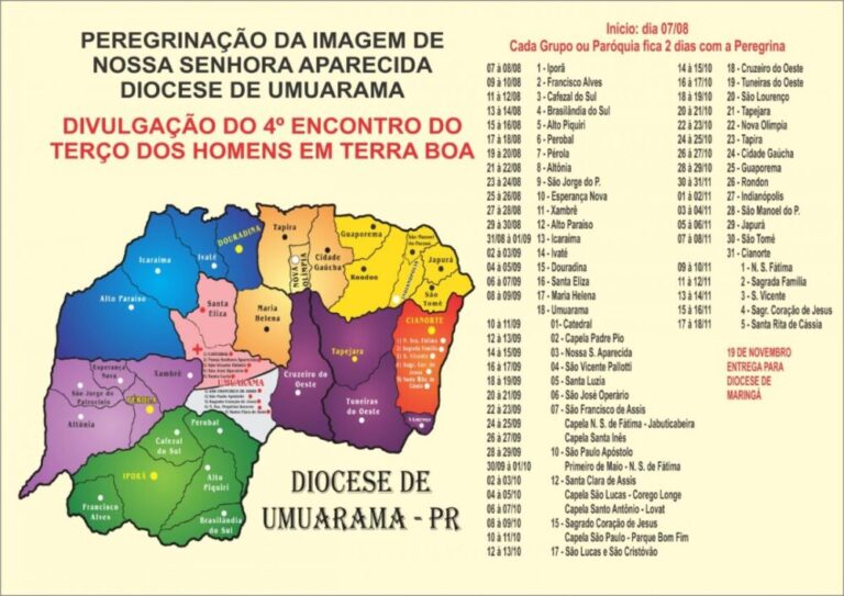 A Diocese de Umuarama está recebendo da Diocese de Campo Mourão uma imagem Peregrina de Nossa Senhora Aparecida, ela foi enviada no dia 29 de Abril, durante o 3º Encontro Regional do Terço dos Homens, realizado na Cidade de Terra Boa. Esta imagem está percorrendo todas as Dioceses e Arquidiocese do Paraná, e agora chegou […]