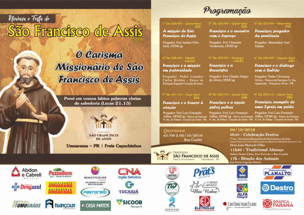 No dia 4 de outubro, dia de São Francisco de Assis, padroeiro da cidade de Umuarama e da paróquia, a Santa Missa Solene está marcada para as 9h30, na Igreja Matriz São Francisco de Assis.