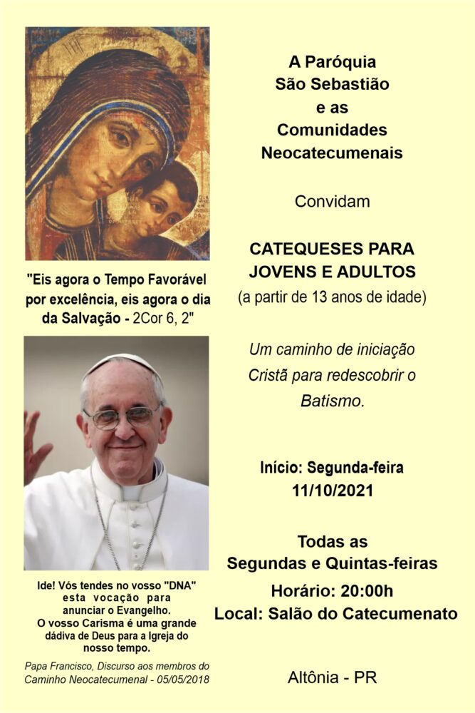 A Paróquia São Sebastião de Altônia e as Comunidades Neocatecumenais convidam para as Catequeses de Jovens e Adultos, a partir dos 13 anos. As catequeses começarão hoje (11/10) no “Catecumenato”.