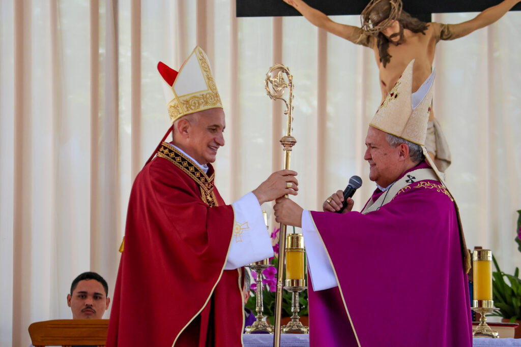 Em seguida, Dom Dimas Lara Barbosa entregou o báculo, sinal do pastoreio, e aproveitou para proferir as seguintes palavras: