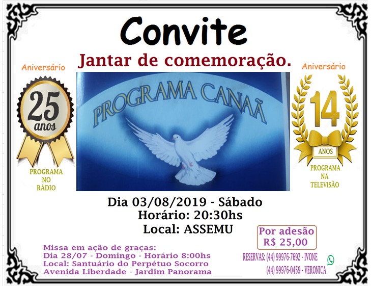 O Programa Canaã comemora 25 anos de programação de rádio e 14 anos na televisão, e com isso convida a todos a participar da Missa em ação de graças, que será neste domingo, 28, na Paróquia Santuário do Perpétuo Socorro, às 08h. A primeira reunião para organizar o programa