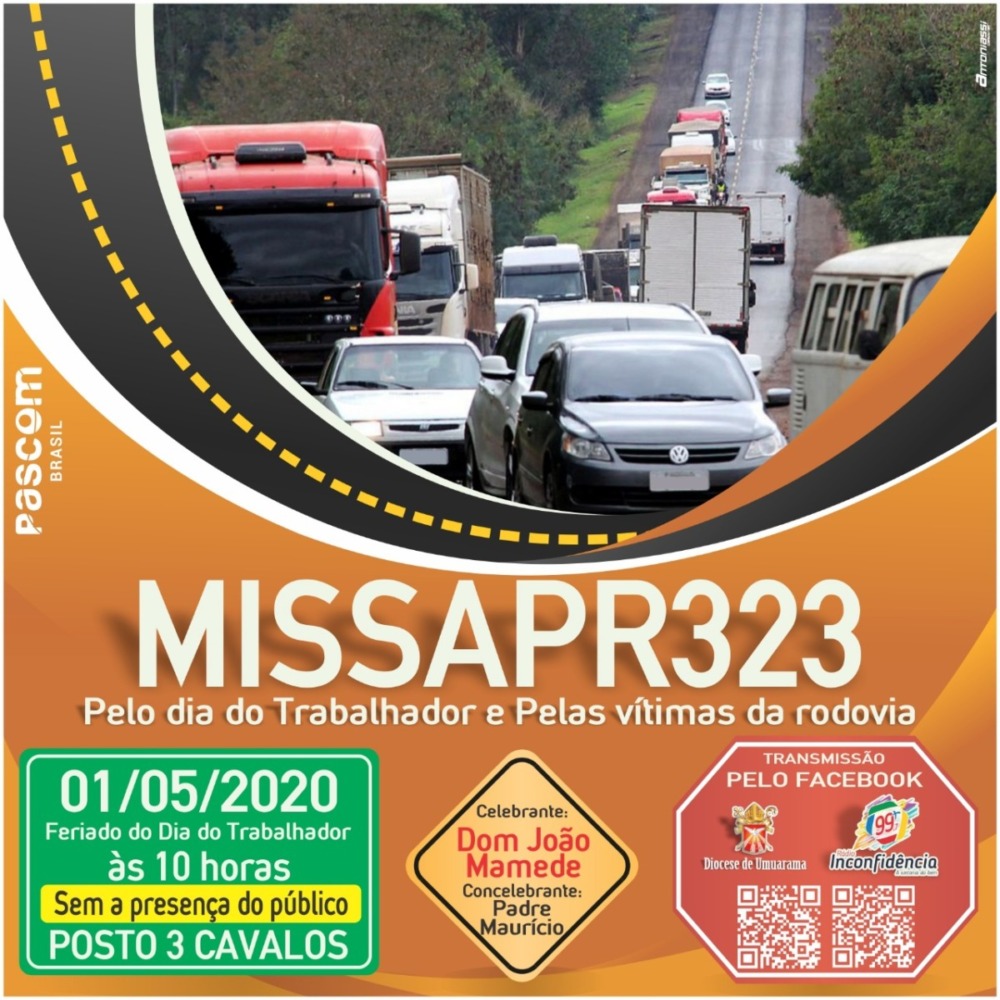 No dia 1º de Maio, às 10h, como de costume, será Celebrada a Missa pelos trabalhadores e vítimas da rodovia PR 323, no Posto 3 Cavalos em Umuarama.